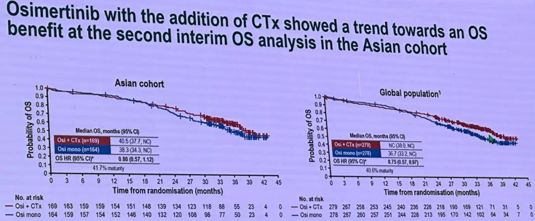 在FLAURA2研究亚洲队列,奥希替尼组和奥希替尼+化疗组的中位PFS分别为19.4个月和25.5个月,中位OS分别为38.3个月和40.5个月,详情见表格1。