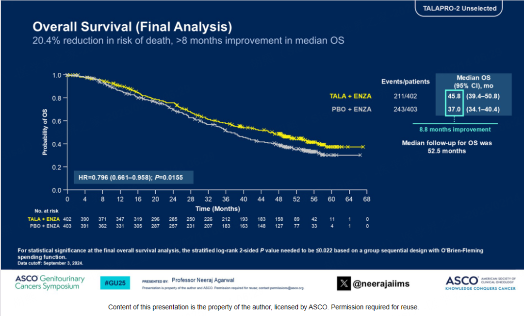 [1]Neeraj Agarwal,et al.Final overall survival(OS)with talazoparib(TALA)+enzalutamide(ENZA)as first-line treatment in unselected patients with metastatic castration-resistant prostate cancer(mCRPC)in the phase 3 TALAPRO-2 trial.2025 ASCO GU.LBA18.