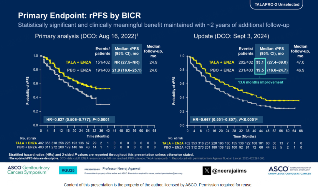 不仅仅是OS,TALAPRO-2研究在主要研究终点上也展现出强劲优势。2025 ASCO GU大会公布的最新rPFS数据显示: