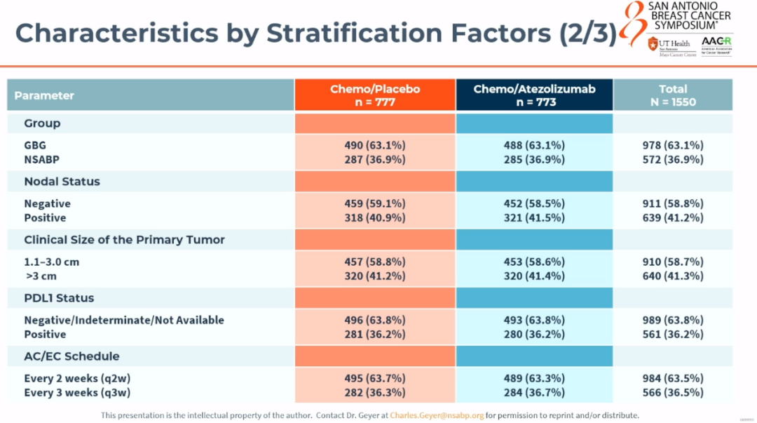 So it was a pretty broad eligibility criteria.The median age of our patients was 49,so it was a younger patient population,but a pretty healthy population.In terms of our stratification variables that we chose for our study,since we were doing recruitment here in the U.S.and Canada.The Germans were going to be doing recruitment in Spain and Germany.So we made continent,so to speak,Europe or U.S.,one of our stratification factors.We made clinical nodal status,a stratification factor,positive versus negative.We also made tumor size.We decided to split our three centimeters.The typical T and M is zero to two,two to five,five or greater.But we knew that if we kind of wanted to have roughly equal groups,so we said up to three and above three,that was a stratification variable.We included PD-L1 as a stratification,PD-L1 staining using the SP142 assay as one of our stratification variables.And then the final stratification variable was the regimen,the rate that they gave the AC or EC,dose down,was it every two weeks?Every three weeks.That was the other stratification variable that we used.