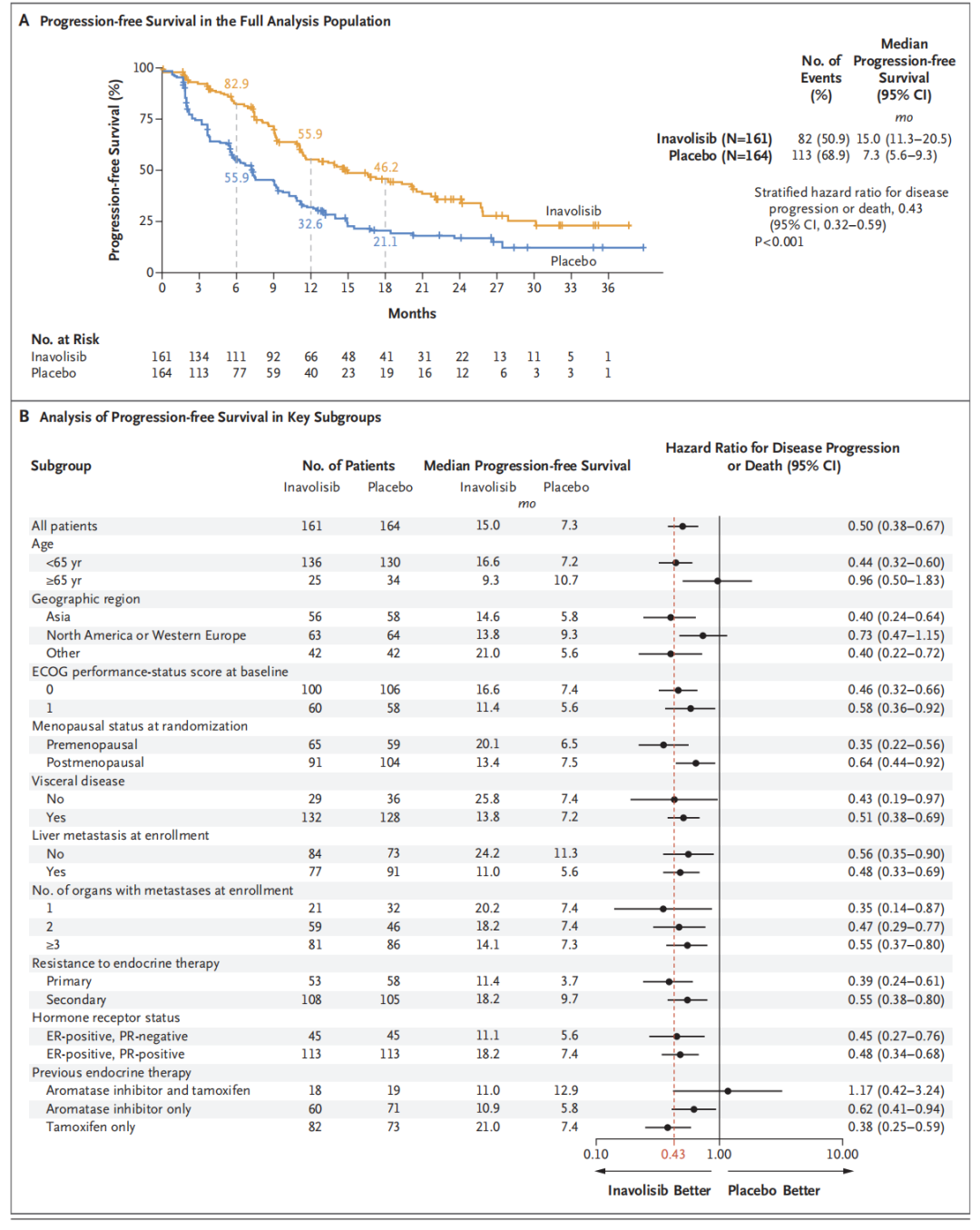 伊那利塞组和安慰剂组的中位PFS分别为15.0个月(95%CI:11.3~20.5)和7.3个月(95%CI:5.6~9.3)[疾病进展或死亡的风险比(HR),0.43;95%CI:0.32~0.59;P<0.001]。(图1.A)。