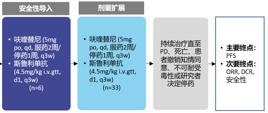 研究数据表明肾癌初诊患者发生转移的比例约为20%-30%,另有约25%局限性肾癌患者经过手术治疗后会出现局部复发或远处转移。肾癌患者一旦出现转移,其生存预后均较差,需通过全身系统的治疗以控制疾病进展,针对晚期nccRCC患者的有效治疗方案仍不确定。在此前的临床研究中,VEGFR抑制剂呋喹替尼与PD-1抑制剂斯鲁利单抗的联合疗法在nccRCC中显示出有前景的疗效和良好的安全性。呋喹替尼是一种VEGFR1/2/3抑制剂,已在中国、美国、欧洲、日本等多个国家获批用于转移性结直肠癌的治疗。斯鲁利单抗是一种抗PD-1单克隆抗体,已在中国和印度尼西亚获批用于小细胞肺癌的一线治疗。这项单臂、多中心、II期研究旨在探索呋喹替尼联合斯鲁利单抗在转移性/不可切除nccRCC的疗效和安全性。