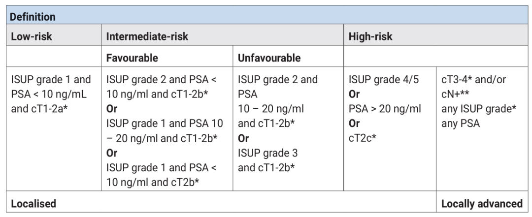 根据系统活检更新局部和局部晚期前列腺癌生化复发的EAU风险分组。EAU中危组现已进一步划分为预后较好组(favourable)和预后较差组(unfavourable)。