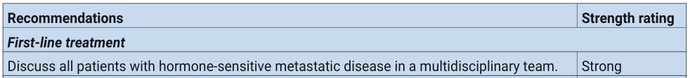 第6.6.9节-激素敏感性转移性疾病一线治疗建议中关于在多学科团队中讨论所有激素敏感性转移性疾病患者的新建议。