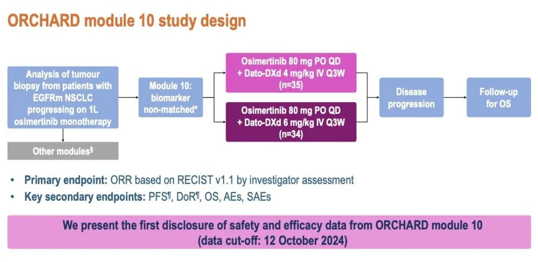患者接受口服奥希替尼(80mg,每日一次)联合静脉注射Dato-DXd(分为两个队列,剂量分别为4mg/kg和6mg/kg,每三周一次)。入组从4mg队列开始,随后扩展到6mg队列,之后两个剂量水平同时入组患者。主要终点:客观缓解率(ORR,研究者评估)。次要终点:缓解持续时间(DoR)、无进展生存期(PFS)、总生存期(OS)和安全性。数据截止日期(DCO):2024年10月12日。