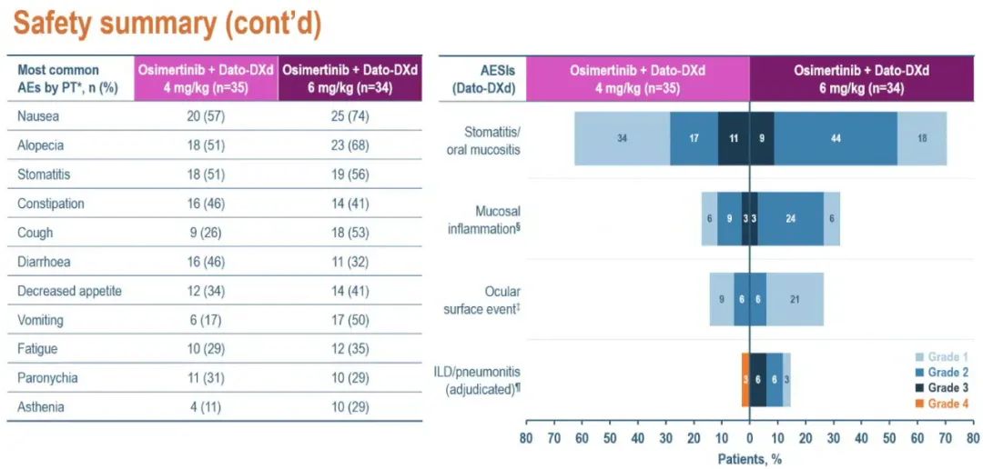 6mg队列中,有更多患者出现与任何治疗相关的≥3级不良事件(4mg/6mg队列:34%/56%)、导致Dato-DXd剂量降低的不良事件(4mg/6mg队列:23%/59%)以及经判定的间质性肺疾病/肺炎(4mg/6mg队列:任何级别分别为3%/15%;≥3级分别为3%/6%)。