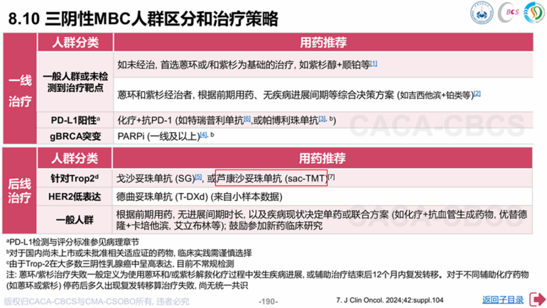 《中国抗癌协会与中华医学会肿瘤学分会乳腺癌诊治指南与规范(2025年版精要本)》(《CBCS小红书》)[5]推荐芦康沙妥珠单抗作为TNBC二线及后线治疗的标准方案。