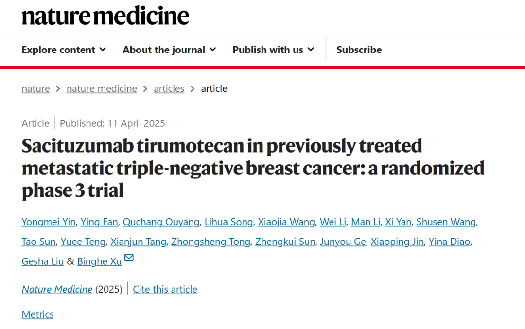 编者按:三阴性乳腺癌(TNBC)是乳腺癌主要亚型之一,以异质性强、侵袭性强、易复发著称,预后不尽人意。TROP2在96%的TNBC患者中存在高表达,是抗体药物偶联物(ADC)开发的理想靶点。2024年11月,我国首个自主研发的TROP2 ADC芦康沙妥珠单抗(SKB264/sac-TMT)获批用于mTNBC的二线治疗,为患者带来了中国方案。该适应症的获批是基于OptiTROP-Breast01研究所取得的阳性结果。该研究的Leading PI为中国医学科学院肿瘤医院徐兵河院士,Co-Leading PI为江苏省人民医院殷咏梅教授。继2024年美国临床肿瘤学会(ASCO)年会披露了该研究的重要结果后,2025年4月11日,OptiTROP-Breast01研究全文刊发于《Nature Medicine》(IF:58.7),再次夯实了芦康沙妥珠单抗在TNBC的二线治疗地位,同时彰显了中国研究在全球的影响力。