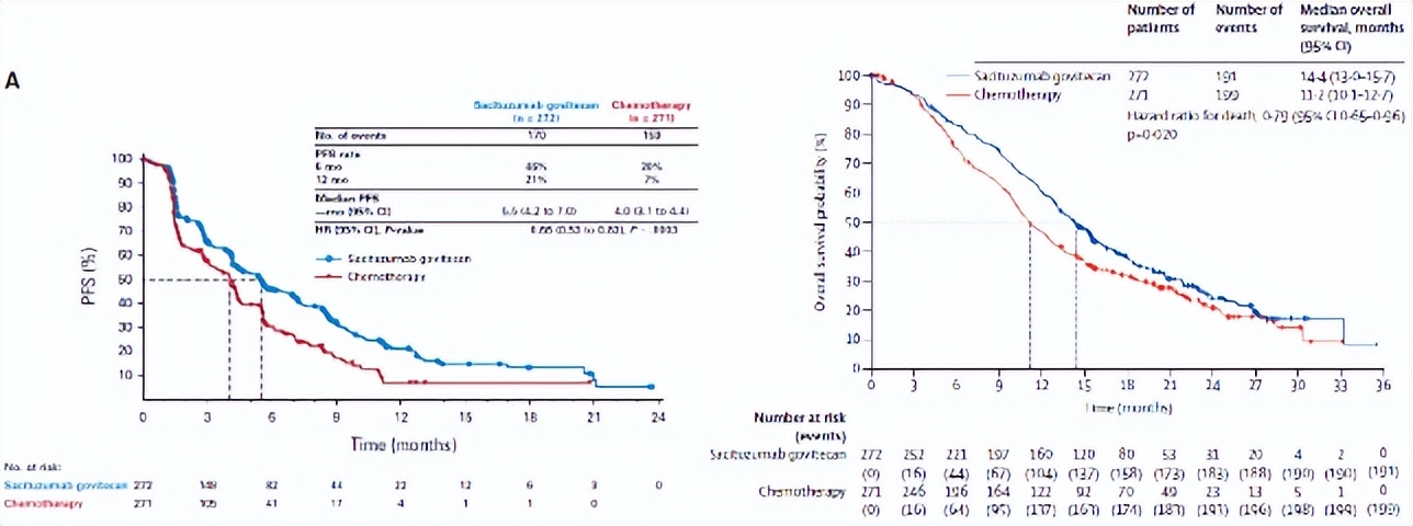 TROPiCS-02研究已经证实,HR+/HER2-乳腺癌患者内分泌治疗耐药后,SG较医生选择的化疗方案(TPC)可以显著改善中位无进展生存期(mPFS 5.5个月vs 4.0个月;HR 0.66,95%CI:0.53-0.83;P=0.0003)和中位总生存期(mOS 14.4个月vs 11.2个月;HR 0.79,95%CI:0.65-0.96;P=0.020)(图1)[2,3]。然而该研究纳入的亚裔人群较少,需要我们进一步予以验证。