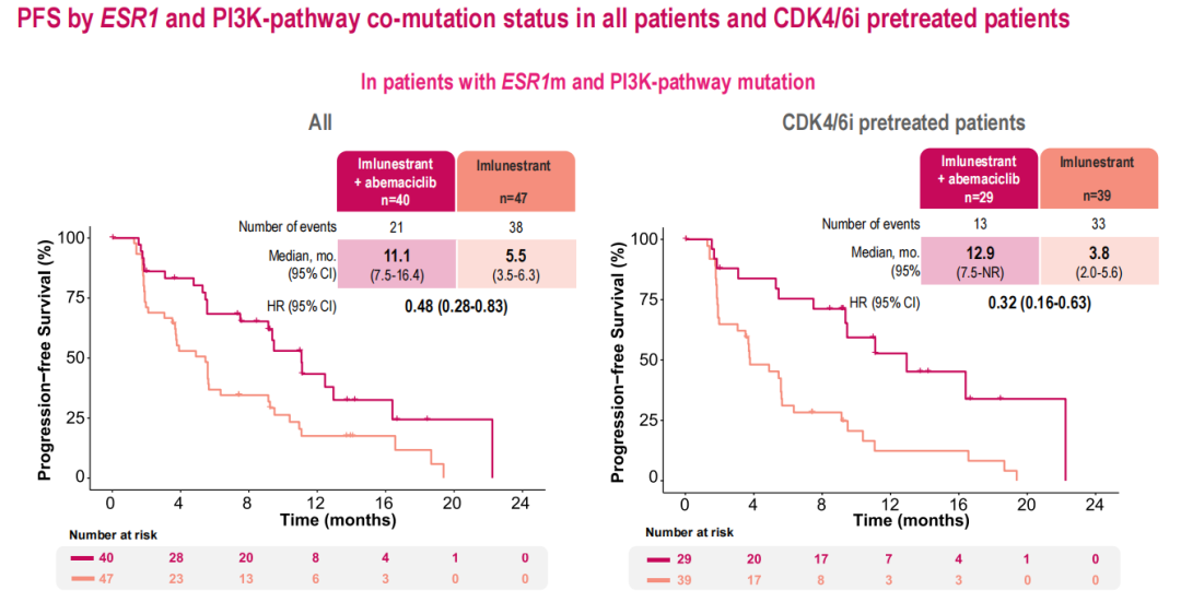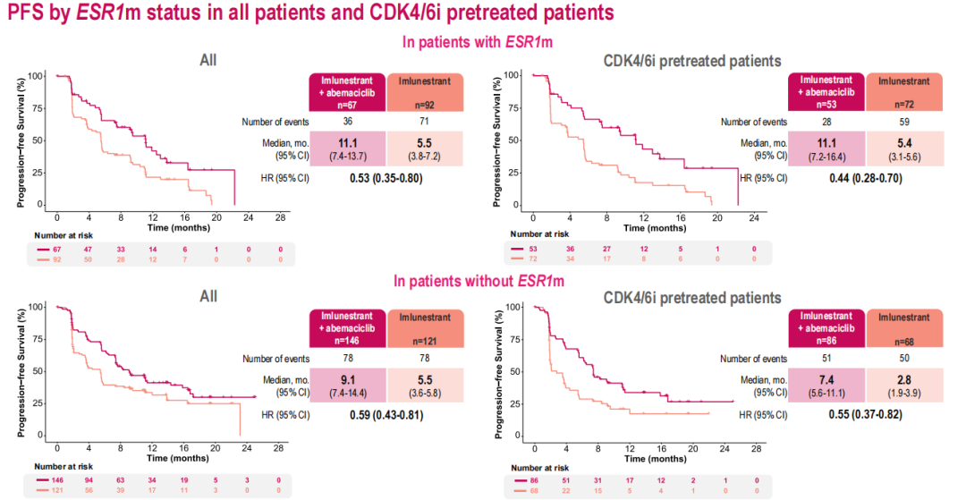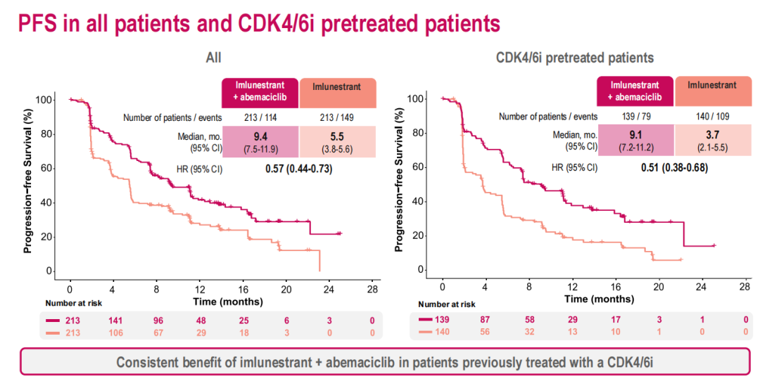 在CDK4/6i经治的患者中,Imlunestrant+阿贝西利组相较于Imlunestrant组显示出PFS获益(中位PFS 9.1个月vs 3.7个月;HR=0.51,95%CI:0.38~0.68)。