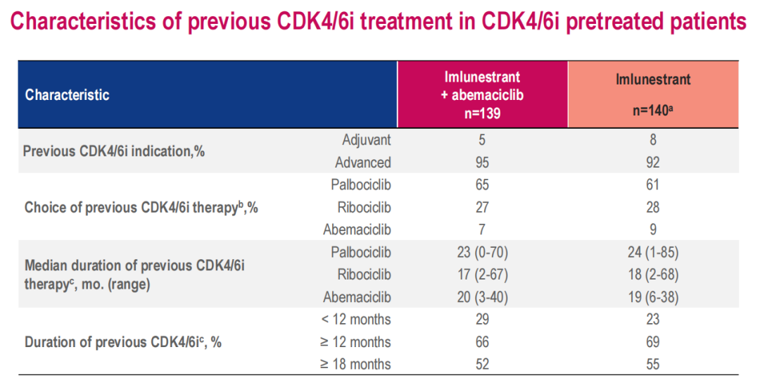 在874例患者中,426例同时被随机分配至Imlunestrant+阿贝西利组或Imlunestrant组(每组n=213);其中大多数(n=279,65%)已接受过CDK4/6i治疗。在CDK4/6i经治患者中,基线特征基本平衡;56%有内脏转移,37%有ESR1突变,40%有PI3K通路突变。大多数患者(70%)接受CDK4/6i治疗的时间≥12个月。