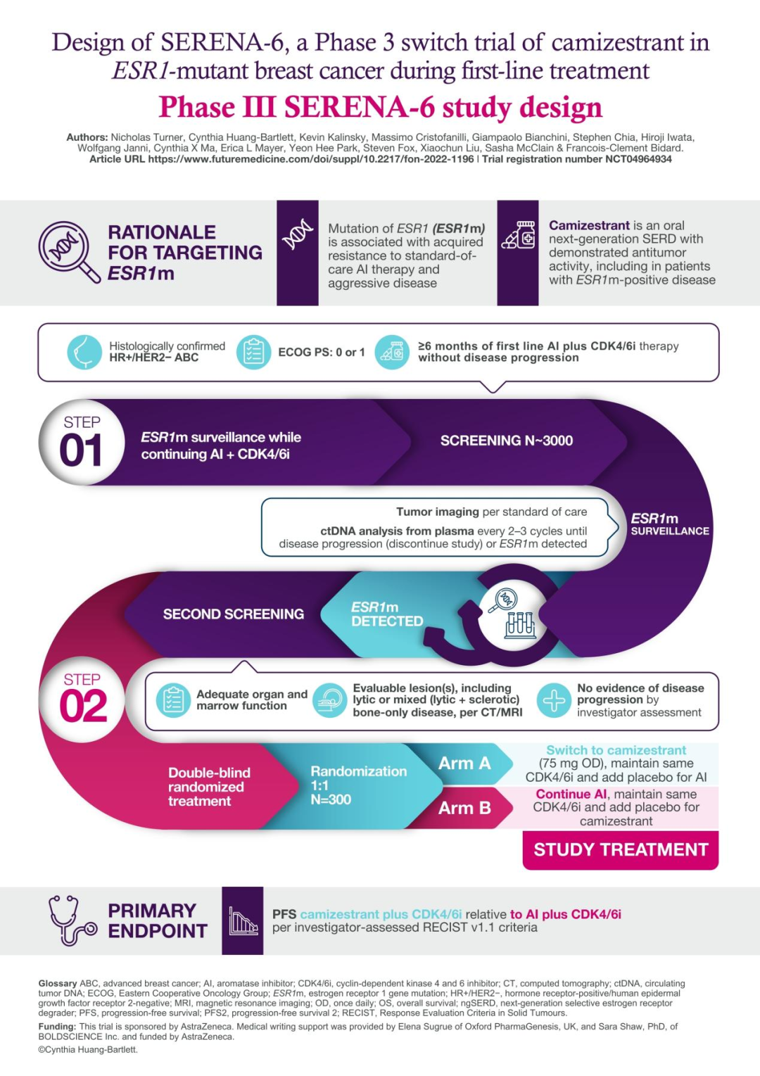 郭宝良教授:SERENA-6是一项III期双盲、随机研究,旨在评估Camizestrant与CDK4/6抑制剂(包括哌柏西利、瑞波西利、阿贝西利)联合治疗相较于AI与CDK4/6抑制剂联合治疗在疾病进展之前出现ESR1突变(ESR1m)的HR+/HER2-晚期乳腺癌中的疗效和安全性。研究共纳入3256例已接受至少6个月一线AI(阿那曲唑/来曲唑)+CDK4/6抑制剂治疗的HR+/HER2-晚期乳腺癌患者,每2-3个月进行一次ctDNA检测以筛查ESR1m,并与常规影像学检查同步进行。