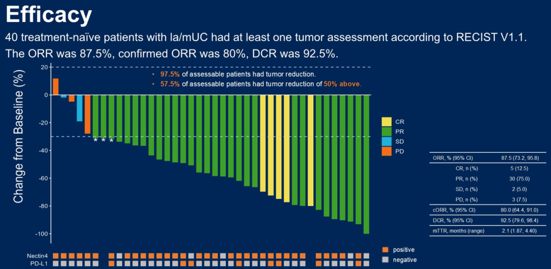 不同亚组中能观察到良好疗效,肝转移患者的ORR为88.2%,膀胱癌患者的ORR为94.4%,Nectin-4阴性表达肿瘤患者的ORR为100%。研究多数治疗相关不良事件(TRAEs)为1-2级,没有发生因TRAEs导致的死亡。