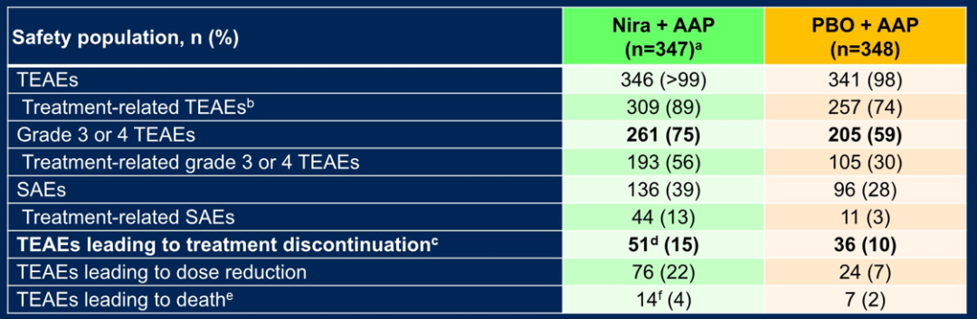 3/4级不良事件在尼拉帕利+AAP组发生率为75.2%,在对照组发生率为58.9%,最常见的是贫血(29.1%vs 4.6%)和高血压(26.5%vs 18.4%)。因AE导致的治疗中断率较低:尼拉帕利+AAP组:11.0%;对照组:6.9%。