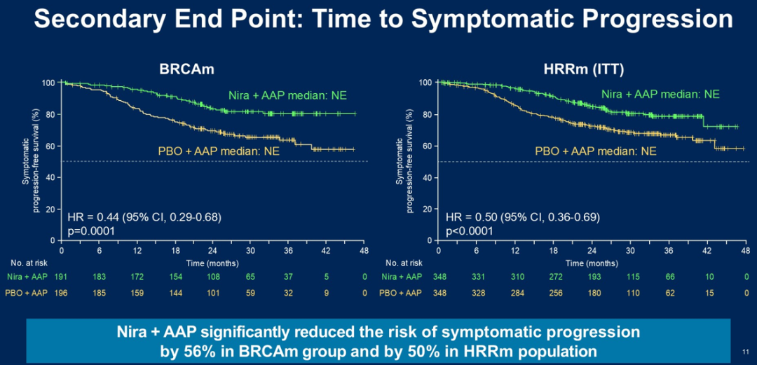 在整个研究人群中,与安慰剂加AAP相比,尼拉帕利加AAP组放射学进展或死亡的风险降低了37%(HR 0.63,95%CI 0.49-0.80;P=0.0001)。