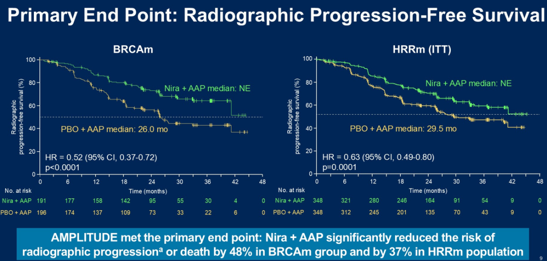 为了确定PARP抑制对去势敏感性疾病患者群体是否有效,启动了3期AMPLITUDE试验。AMPLITUDE将696名存在mCSPC和HRR基因变异的患者随机分配至尼拉帕利联合AAP治疗组(348名患者)或安慰剂联合AAP治疗组(348名患者)。患者既往接受的雄激素剥夺治疗不超过6个月和/或多西他赛治疗不超过6个周期。主要终点是研究者评估的rPFS;次要终点包括症状进展时间、OS和安全性结局。