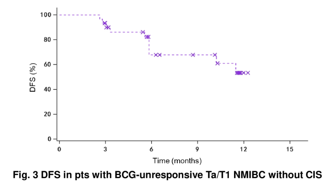 SHR-1501则是一种IL-15激动剂融合蛋白,可增强NK细胞和CD8+T细胞活性。我们的1/2期研究显示也显示了SHR-1501±BCG有积极的初步疗效,队列B(BCG无应答的CIS患者)的3或6个月CR率达90.9%,队列A(BCG初治患者)和队列C(BCG无应答的乳头状瘤患者)的9个月DFS率分别为94.4%和53.9%;无剂量限制性毒性(DLT),也没有达到最大耐受剂量(MTD)。