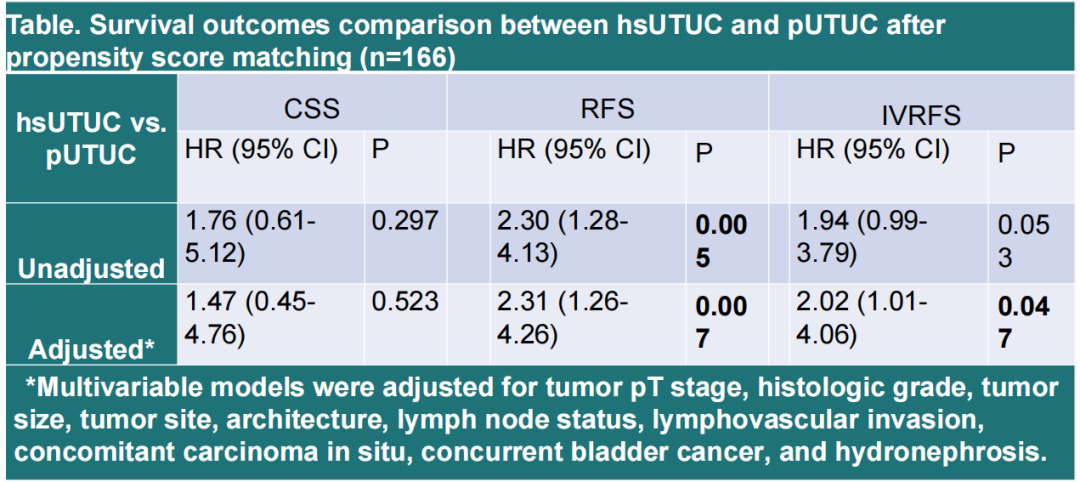△hsUTUC对比pUTUC的癌症特异生存(CSS)、无复发生存(RFS)、无膀胱浸润性生存(IVRFS)风险