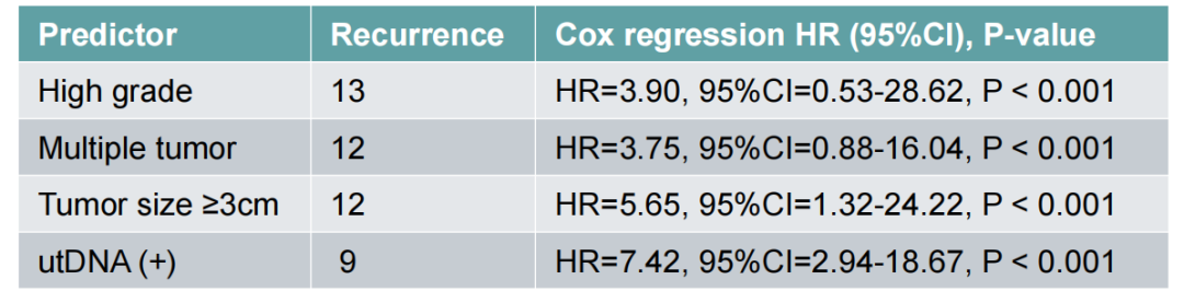 我们回顾性分析了我们中心130例完成utDNA检测和二次电切的非肌层浸润性膀胱癌患者,其中39例患者utDNA检测阳性,在这39例阳性患者中35例患者的二次电切病理检测出了肿瘤残留,也就是说utDNA对于二次电切病理的阳性预测值为89.7%。阴性预测值为87.9%。因此,utDNA可以作为筛选工具用于指导NMIBC患者的二次电切,此外utDNA也是NMIBC患者预后的独立预测因素。