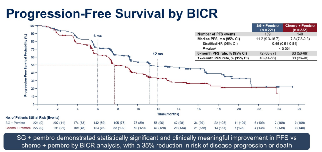 众所周知,约有40%的TNBC患者为PD-L1阳性[1]。免疫治疗联合化疗是此类患者的一线标准治疗方案,中位无进展生存期(PFS)可达9.7个月[2]。与此同时,戈沙妥珠单抗作为靶向Trop-2的ADC药物,二线治疗TNBC可较化疗取得了显著的PFS和总生存(OS)改善,从而成为了标准的二线治疗方案[3]