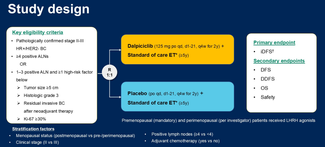 在高危人群的设定方面,DAWNA-A研究的入组人群均为腋窝淋巴结阳性的患者,包括≥4枚腋结阳性,或1-3枚腋结阳性且存在以下高危因素之一:肿瘤直径≥5cm、组织学分级3级、新辅助治疗后残存浸润性乳腺癌,以及Ki-67≥30%。这样的高危人群界定非常贴合临床实践。对照NATALEE、monarchE等研究来看,DAWNA-A研究的高危人群定义有一定的差异,尤其是在Ki-67≥30%,临床通常将其视为相对高危因素;再者是该研究对新辅助治疗后的入组条件也有较为清晰的说明,凡有浸润性残存疾病者均可入组,且该研究中新辅助治疗的患者比例达到近30%,绝经前/围绝经期患者的比例达到近60%,这些情况都非常符合中国的临床实践。