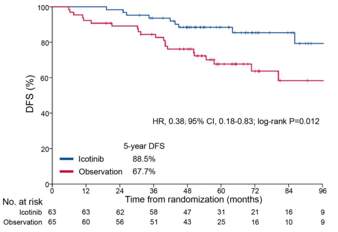 中位随访65.0个月显示,埃克替尼组vs观察组的5年DFS率为88.5%vs 67.7%,(log-rank P=0.012,HR=0.38;95%CI:0.18-0.83),埃克替尼降低了62%的疾病进展或死亡风险,首次证实了第一代EGFR-TKI在IB期NSCLC患者中的长期获益