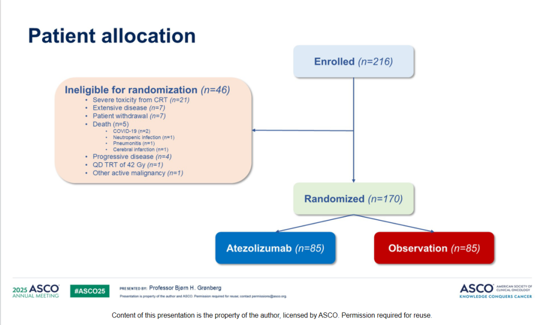 患者基线:2018年7月至2022年4月期间,欧洲37家医院共纳入216例患者,其中170例(78.7%)完成随机分组(阿替利珠单抗组85例,观察组85例)。中位年龄66岁,46%为女性,92%的患者PS 0-1分,82%为III期疾病。