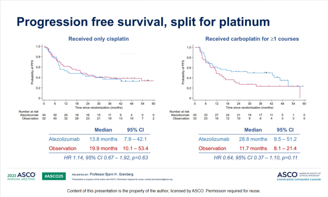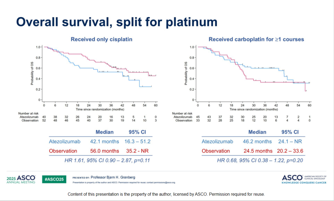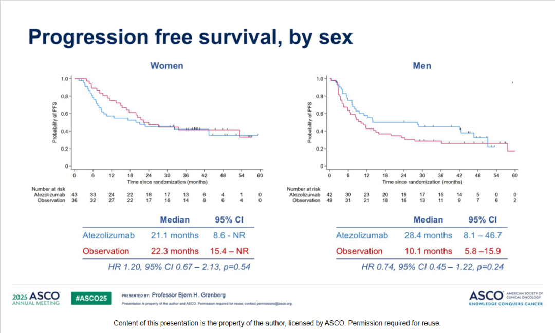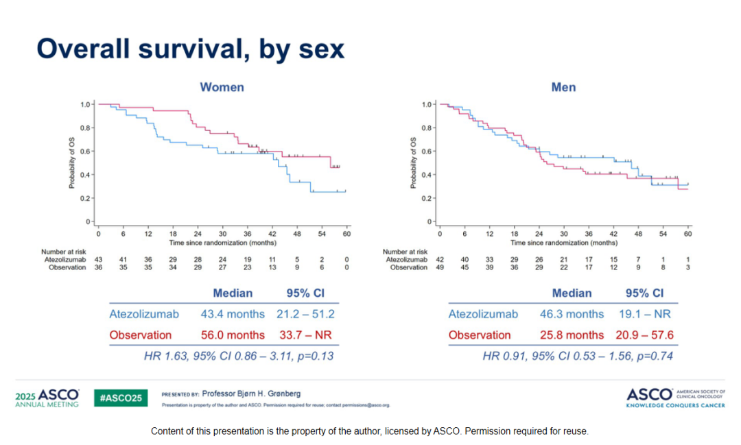 However,we did not find the benefit in terms of overall survival,which was the primer endpoint or PFS,but looking into subgroups,we saw that there were some differences among women,their survival among the patients randomized to the observation arm was much longer than expected.And that can maybe explain why the survival curves looks a little bit different than what we expected.Furthermore,we also saw that the patients will receive carboplatin.Those patients appeared to benefit from atezolizumab.This is something that was also shown in subgroup analysis of atezo group.So maybe there are some imbalances that we do not know about.That can maybe explain why this trial was negative.