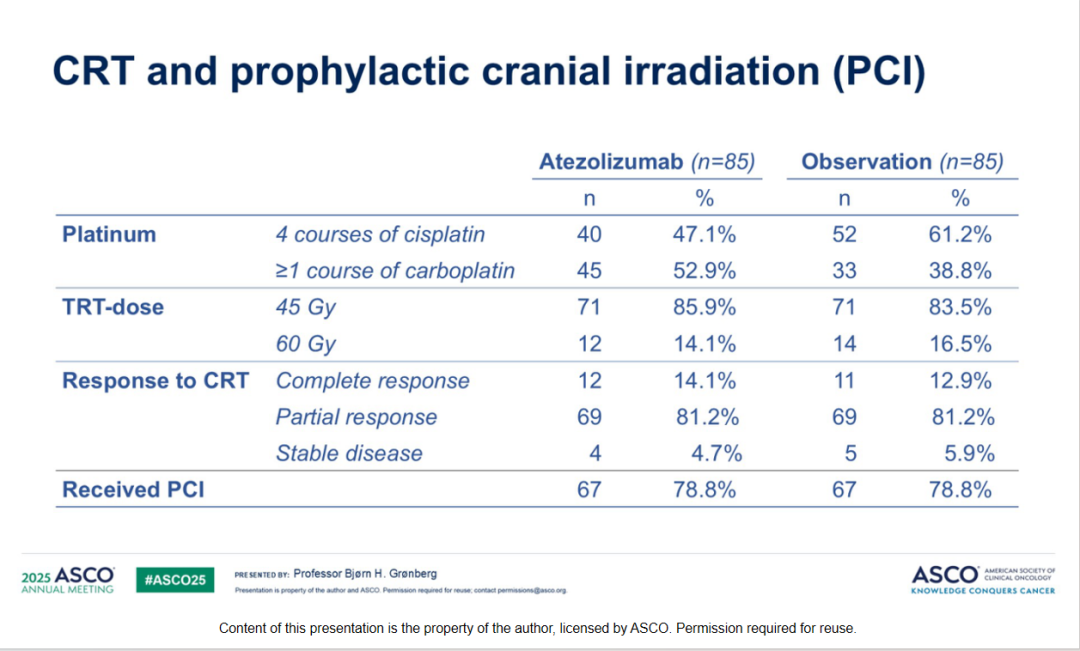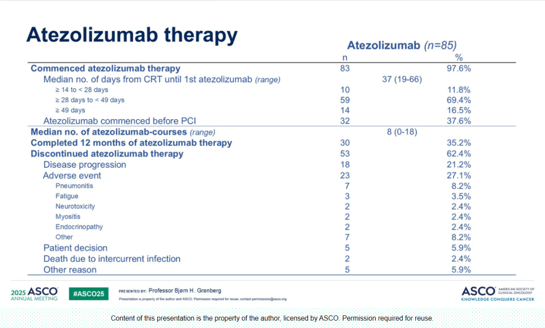 Bjørn Henning Grønberg教授:这是一项在欧洲开展的临床研究,共纳入了来自欧洲六个国家的37家医院的260例患者,均接受了铂类联合依托泊苷的化疗方案同步每日两次45~60 Gy TRT方案,患者按1:1比例随机分配至阿替利珠单抗组或对照组,治疗时间为1年。我们发现阿替利珠单抗组的中位治疗周期为8次。尽管试验组不良事件发生率更高,但未发现新的安全信号,35.2%的患者完成了1年治疗。
