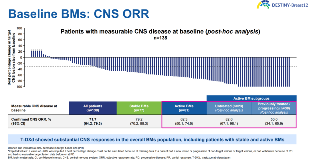 以T-DXd为代表的新型ADC药物也显示出了较好的治疗疗效,从DB-01、02、03针对HER2阳性脑转移患者的汇总分析,到去年ESMO大会上公布的DB-12的研究数据,均显示T-DXd在HER2阳性脑转移患者的良好治疗效果。DB-12研究入组了既往经1线或多线抗HER2方案治疗患者,263名患者基线有脑转移,241名患者基线没有脑转移。研究结果显示,基线有脑转移患者其中位PFS可达17.3个月,总体客观缓解率(ORR)可达71.7%。研究结果还提示,T-DXd无论对于稳定性脑转移还是活动性脑转移患者均有良好治疗效果。综上所述,对于部分脑转移症状不严重、不急于进行局部处理的患者,优先进行全身治疗已成为公认的治疗策略。