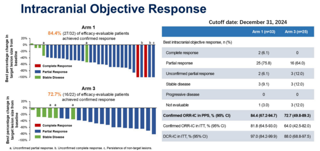 截至2024年12月31日,研究结果显示:Arm 1组确认的颅内ORR为84.4%(27/32);Arm 3组颅内ORR为72.7%(16/22)。两组的颅内ORR与总ORR疗效相似,所有患者颅内疾病控制效果较好。Arm 1组中位无进展生存期(PFS)为13.2个月(95%CI:10.0-15.4),Arm 3组的PFS尚未成熟。