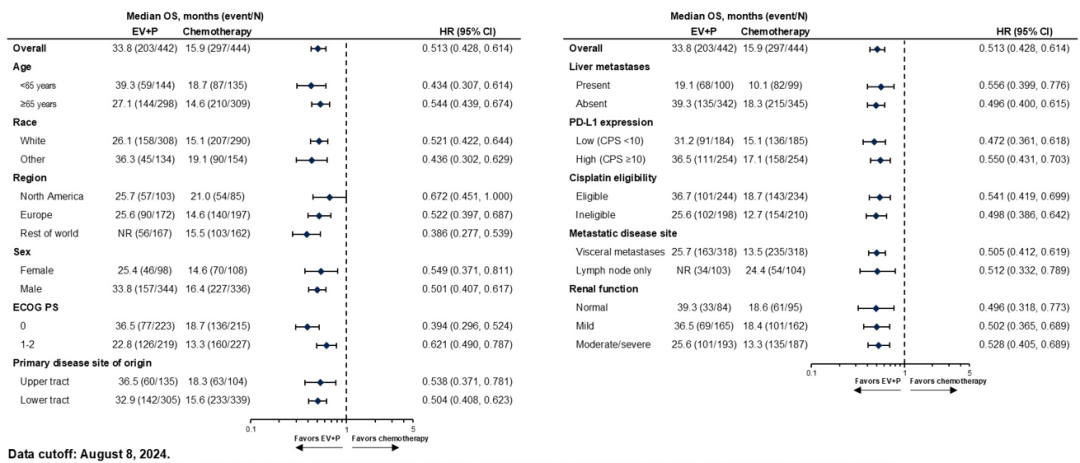 亚组分析显示不同预设亚组患者继续保持一致的OS获益,包括不同原发部位(上尿道和下尿道)、疾病转移部位(内脏转移或仅淋巴结转移)、PD-L1阳性(CPS≥10)或阴性(CPS<10)、是否肝转移等患者均可从维恩妥尤单抗联合帕博利珠单抗治疗中降低死亡风险,尤其该治疗方案的获益不受PD-L1表达水平影响(PD-L1阳性和阴性患者HR分别为0.550和0.472)。此外,此次延长随访的数据中,不同亚组的PFS、客观缓解率(ORR)、持续缓解时间(DoR)同样证实了维恩妥尤单抗联合方案的持续获益[5]