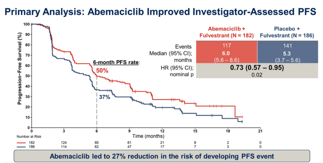 [2]、Kevin Kalinsky,et al.Abemaciclib plus fulvestrant vs fulvestrant alone for HR+,HER2-advanced breast cancer following progression on a prior CDK4/6 inhibitor plus endocrine therapy:Primary outcome of the phase 3 postMONARCH trial.2024 ASCO abstract LBA1001.