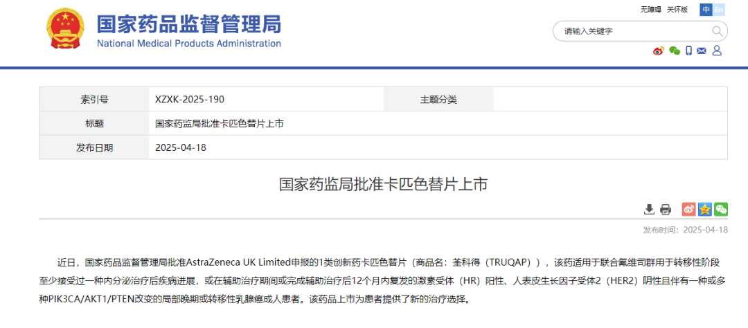 2025年4月18日,卡匹色替在我国获批上市[8],联合氟维司群用于转移性阶段至少接受过一种内分泌治疗后疾病进展,或在辅助治疗期间或完成辅助治疗后12个月内复发的HR+/HER2-且伴有一种或多种PIK3CA/AKT1/PTEN改变的局部晚期或转移性乳腺癌成人患者。