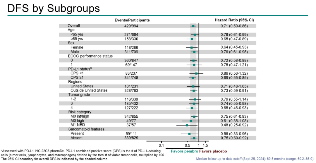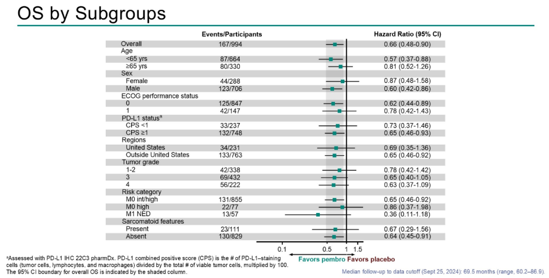 共994例患者被随机分配接受帕博利珠单抗(n=496)或安慰剂(n=98)治疗。截至2024年9月25日的数据截止日期,中位随访时间为69.5个月。所有患者在3年前完成了或停止了研究治疗。帕博利珠单抗组和安慰剂组分别发生了188例和241例DFS事件。中位DFS未达到(NR),而安慰剂组为68.3个月(HR 0.71,95%CI:0.59-0.86);5年时的估计DFS率分别为60.9%和52.2%。帕博利珠单抗组和安慰剂组分别发生了68例和99例OS事件。两组的中位OS均为NR(HR 0.66,95%CI:0.48-0.90);5年时的估计OS率分别为87.7%和82.3%。DFS和OS结果在包括预先规定的风险和肉瘤样特征在内的关键亚组中是一致的。在3年内没有报告新的严重治疗相关不良反应。
