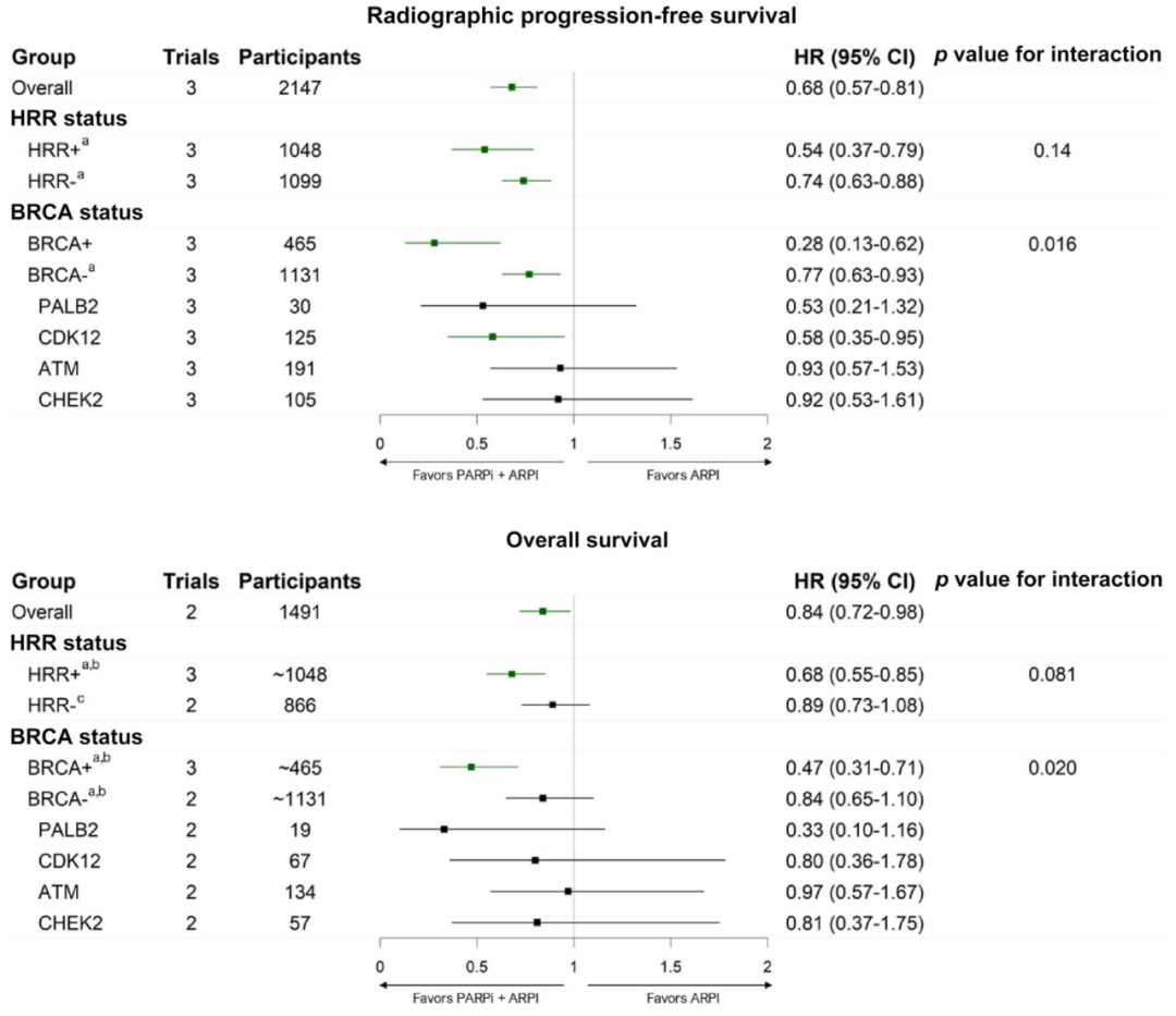 图4.临床相关亚组中PARP抑制联合雄激素受体通路抑制剂的疗效差异
