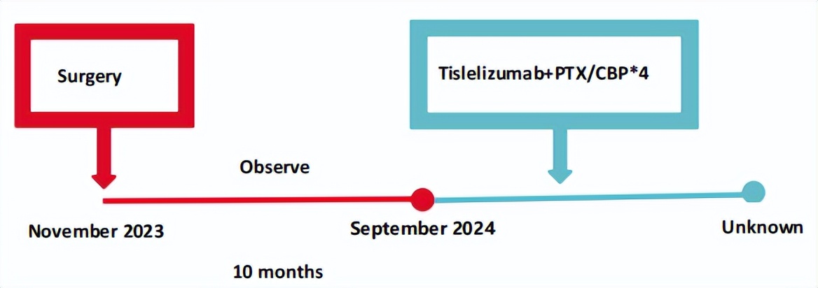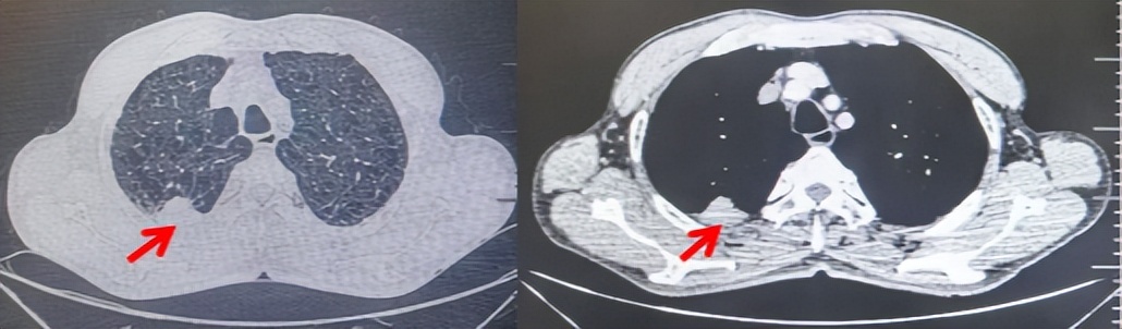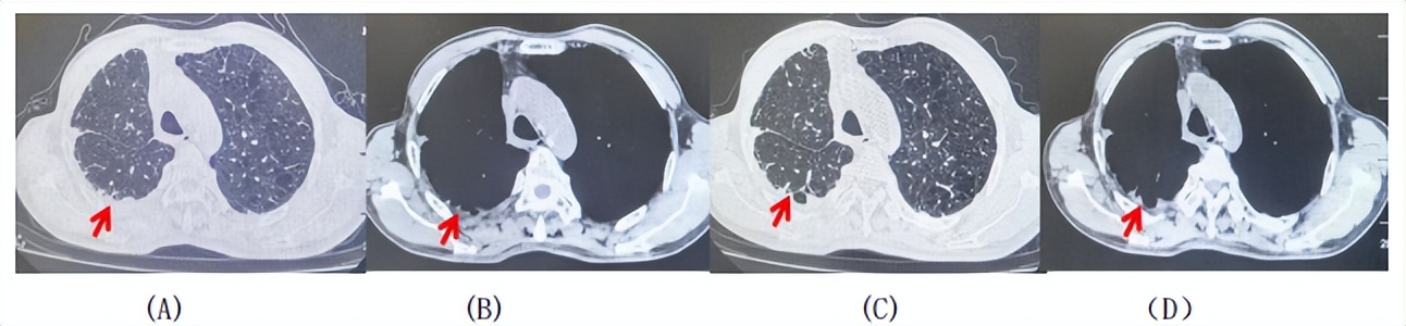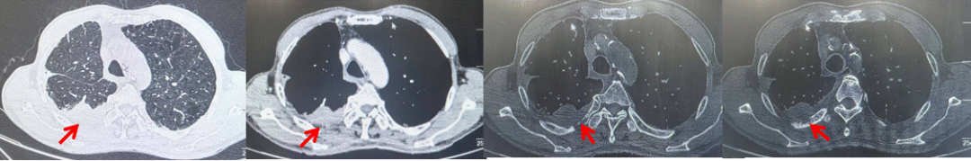 2024.11.19患者出现右侧胸痛,复查胸部CT检查示右侧胸膜肿物,大小约31mmX24mm,右侧4、5肋骨骨质破坏,考虑转移(如图2)。建议患者穿刺活检取病理明确诊断,患者拒绝,经MDT会诊后结合影像学表现及病史考虑为胸膜转移,肋骨转移,分期为rT0N0M1a IVA期,DFS仅仅17个月。2024.12.05起行信迪利单抗联合培美曲塞+卡铂方案治疗4周期,复查胸CT评效PR(如图3)。之后给予信迪利单抗+培美曲塞维持治疗6周期,期间复查CT评效PR(如图3)。目前信迪利单抗+培美曲塞维持治疗中,截止至目前PFS约为8个月,治疗期间未出现明显毒副反应。