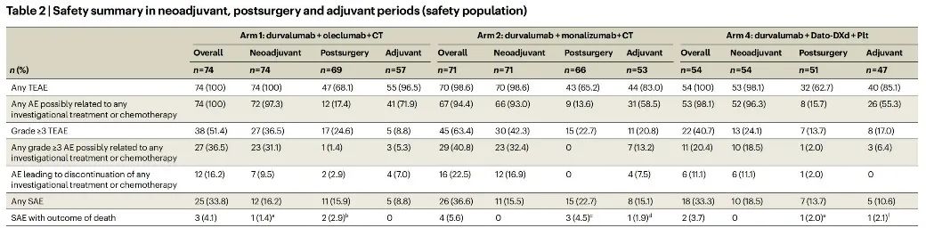 研究中,队列1接受新辅助度伐利尤单抗联合化疗联合Oleclumab随后接受手术,术后给予辅助度伐利尤单抗联合Oleclumab治疗;队列2接受新辅助度伐利尤单抗联合含铂双药治疗联合Monalizumab,随后手术,术后接受度伐利尤单抗联合Monalizumab治疗;队列4接受度伐利尤单抗联合Dato-Dxd以及单药铂类治疗,随后进行手术,患者分期为IIa-IIIb期,不携带驱动基因突变。