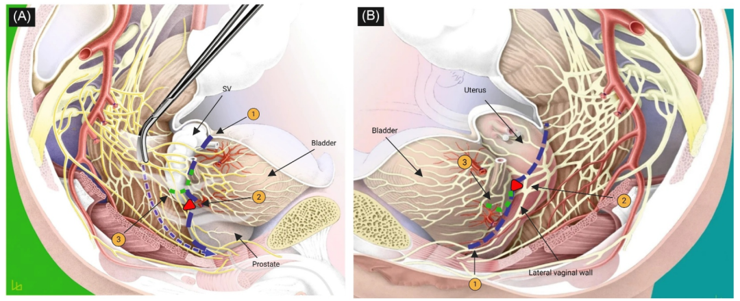 图1.男性和女性盆腔解剖分离模型示意图:(A)男性膀胱背侧、前列腺背侧与精囊腺前壁之间的解剖平面。该层面需精确分离,以避免损伤走行于前列腺外侧的神经血管束。膀胱壁、精囊腺与前列腺基底之间的关键解剖夹角。精囊腺(SV)腹侧平面的分离应避免损伤位于精囊背外侧的盆腔神经血管丛。(B)女性膀胱背侧与子宫-宫颈前壁之间的解剖平面。该层面需精确分离,以避免损伤走行于阴道旁间隙腹外侧的神经血管束。膀胱三角区、阴道侧壁与子宫颈之间的关键解剖夹角。沿阴道旁间隙腹外侧平面进行的分离路径(根据Studer 2015修改)