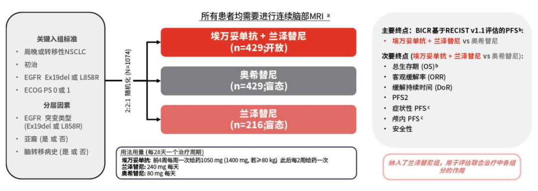 埃万妥单抗(一种具有免疫细胞导向活性的靶向EGFR和间质上皮转化因子(MET)的双特异性抗体)和兰泽替尼(一种口服、高中枢神经系统(CNS)渗透性的第三代EGFR-TKI)在机制上具有互补作用,联合治疗同时靶向EGFR的胞外配体结合结构域和胞内活性位点,更有效的抑制EGFR通路;同时埃万妥单抗靶向MET通路延缓耐药;此外,埃万妥单抗还具有受体降解和免疫细胞导向活性,两者联合在临床前和I期临床研究中均表现出显著的抗肿瘤活性[3-8]。MARIPOSA研究[9]是一项全球III期随机对照研究,旨在评价埃万妥单抗+兰泽替尼、奥希替尼单药及兰泽替尼单药一线治疗EGFR Ex19del/L858R突变局部晚期或转移性NSCLC患者的疗效(图1)。主要终点是盲法独立中央审查(BICR)基于RECIST v1.1评估的无进展生存期(PFS),关键次要终点是总生存期(OS)。
