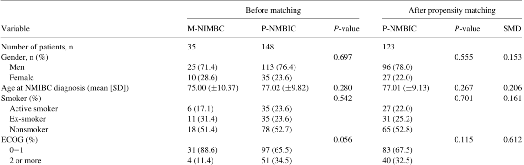 在倾向匹配分析中,对照组由35例异时性NMIBC患者和123例原发NMIBC患者组成。异时性NMIBC患者同样膀胱内高危复发比例较高(54.3%vs.22.8%,P=0.001,HR 2.67),进展为MIBC比例较高(28.6%vs.5.7%,P=0.022,HR 3.42),以及进展为转移性比例较高(20.0%vs.6.5%,P=0.033,HR 3.02)。两组的患者适应良好,多变量分析显示,患者人口统计学特征、EAU风险评分和BCG剂量均无差异。倾向匹配分析显示,总生存率无显著差异(8.6%vs.18.8%,P=0.134,HR 0.40)。