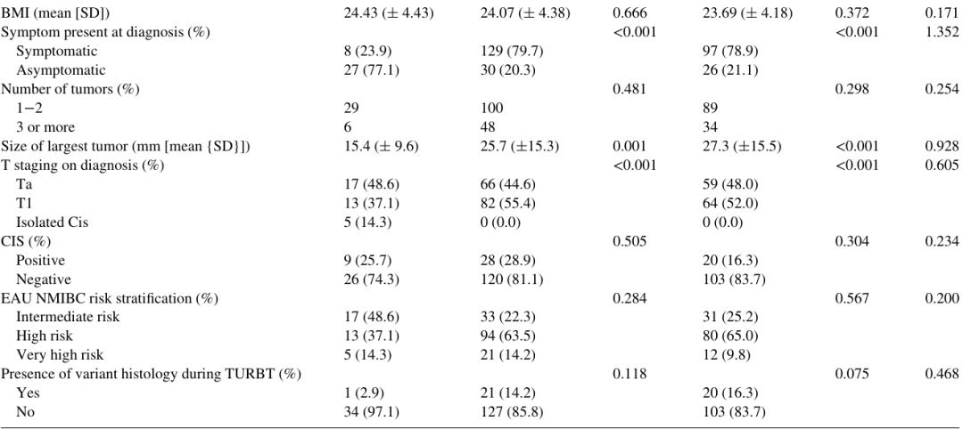 在183例确诊为HG NMIBC的患者中,有35例(19.1%)既往接受过UTUC治疗,并接受过根治性肾输尿管切除术(RNU),且切缘阴性。在异时性NMIBC亚组中,高危患者复发的中位时间为RNU后24个月。异时性NMIBC亚组包括25名男性和10名女性,平均年龄为75.0岁;而原发性NMIBC亚组包括113名男性和35名女性,平均年龄相似,均为77.02岁。