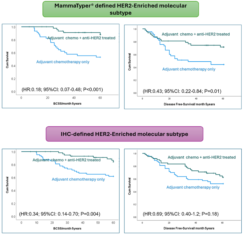 在多变量Cox回归模型中,当根据肿瘤分级、肿瘤大小、淋巴结转移、淋巴管侵犯、组织学肿瘤类型和ER状态调整MammaTyper定义的ERBB2+亚组(251名患者)时,抗HER2治疗是延长5年DFS(HR:0.61,95%CI:0.38-0.96;P=0.031)和5年BCSS(HR:0.21,95%CI:0.18-0.45;P<0.001)的独立预测因子。尽管在IHC定义的HER2+(287名患者)中,抗HER2疗法是更好的BCSS的独立预测因素(HR:0.31,95%CI:0.16-0.57;P<0.001),但不是5年DFS的独立预测因素(HR:0.67,95%CI:0.44-1.02;P=0.063)。
