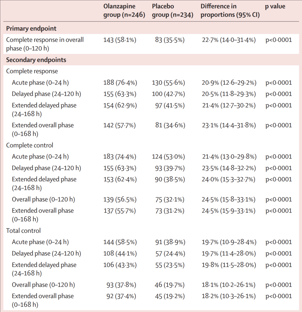 [4]Saito M,Iihara H,Shimokawa M,et al.Overall efficacy and safety of olanzapine 5 mg added to triplet antiemetics for an anthracycline-containing regimen in patients with breast cancer:a phase 3,double-blind,randomised,placebo-controlled trial.Lancet Oncol.2025;26(7):960-970.doi:10.1016/S1470-2045(25)00233-5