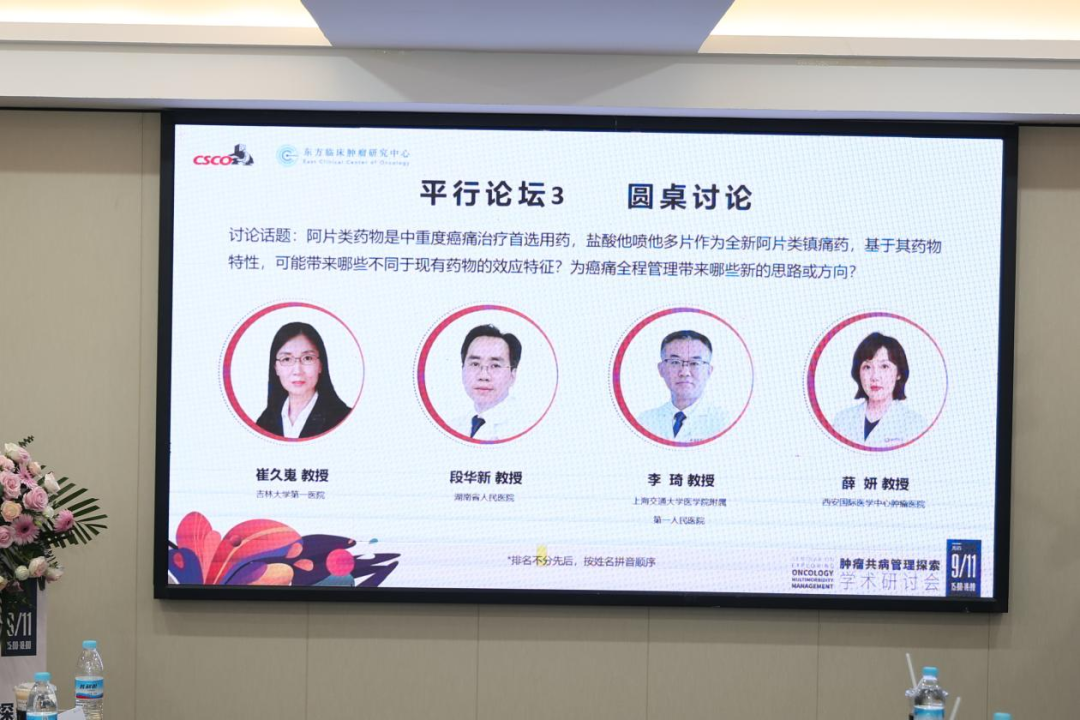 褚倩教授专题学术报告结束后,吉林大学第一医院崔久嵬教授、湖南省人民医院段华新教授、上海交通大学医学院附属第一人民医院李琦教授、西安国际医学中心医院薛妍教授以“阿片类药物是中重度癌痛治疗首选用药,盐酸他喷他多片作为全新阿片类镇痛药,基于其药物特性,可能带来哪些不同于现有药物的效应特征?为癌痛全程管理带来哪些新的思路或方向?”等话题做了热烈地讨论。专家们表示阿片类药物作为中重度癌痛治疗的首选药物,在临床实践中仍受限于传统阿片类药物引发的便秘、恶心呕吐等副作用,亟需兼具更有效和更安全的新型镇痛药物。而新型阿片类镇痛药盐酸他喷他多片,相比于传统阿片类镇痛药,凭借μ-阿片受体(MOR)激动和去甲肾上腺素再摄取抑制(NRI)两种作用机制,在发挥有效镇痛的同时表现出更好的胃肠道耐受性,减少因副作用引起的治疗终止,且滥用发生和戒断症状更少。该药物的上市为疼痛管理领域带来新的希望,为患者提供更安全、更有效的镇痛选择。