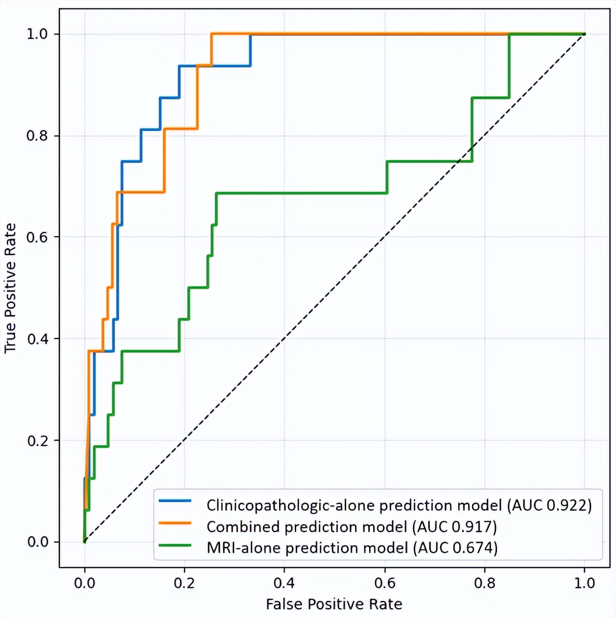 在训练队列中,所有三个模型(MRI模型、临床病理模型和组合模型)均实现了出色的区分度,每个模型的AUC均达到0.99(MRI模型:0.99,95%CI:0.99–1.00;临床病理模型和组合模型:0.99,95%CI:0.99–0.99)。然而,在独立测试队列中展现出了性能差异。
