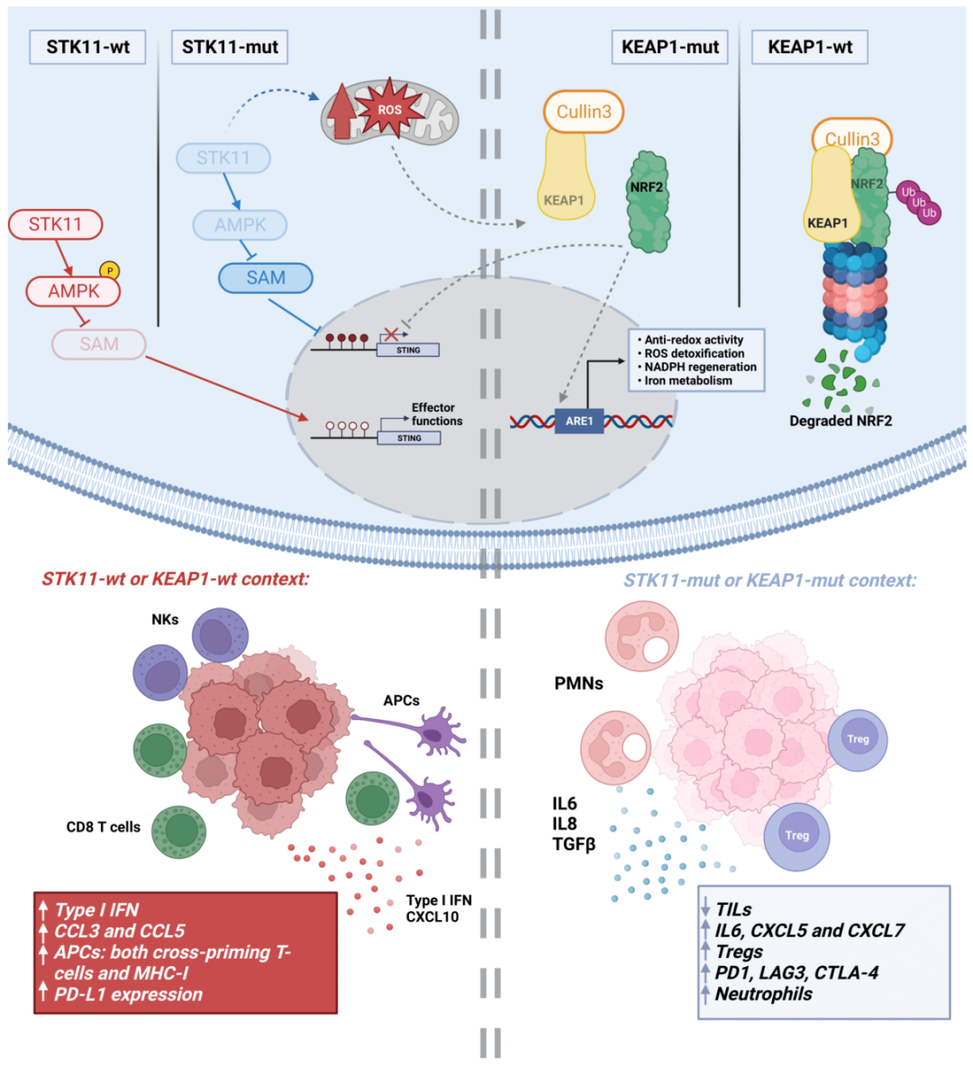 图1.STK11和KEAP1基因突变对癌细胞内部分信号通路及TME的影响(图源[2]