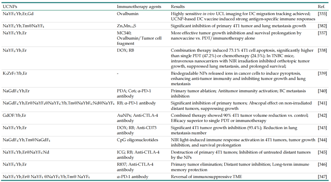 乳腺癌免疫治疗面临免疫抑制肿瘤微环境、响应率低等问题,UCNPs可通过多途径激活免疫应答,提高免疫治疗效果。在树突状细胞疫苗中,UCNPs负载卵清蛋白后,可通过上转换发光成像实时追踪树突状细胞向淋巴结的迁移,且负载卵清蛋白的树突状细胞疫苗可诱导强效抗原特异性免疫,增强CD8+T细胞增殖与干扰素-γ分泌;在免疫原性细胞死亡诱导中,UCNPs介导的化疗-光动力联合治疗可促进肿瘤细胞释放钙网蛋白、ATP等损伤相关分子模式,激活树突状细胞成熟与T细胞浸润。此外,UCNPs还能联合免疫检查点抑制剂进一步放大疗效。例如,NaGdF4:Yb,Er负载Ce6与α-PD-1抗体,光动力治疗诱导免疫原性细胞死亡后,α-PD-1打破免疫抑制,不仅实现原发肿瘤消融,还对未照射的远端肿瘤产生“远隔效应”,显著抑制肺转移。