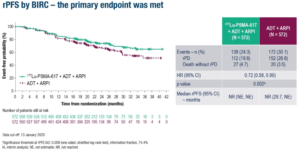 在转移性激素敏感性前列腺癌(mHSPC)领域,III期PSMAddition试验为相关治疗提供了有力证据。这项重要的临床试验共纳入了1144例患者,这些患者均被确诊为前列腺特异性膜抗原(PSMA)阳性的mHSPC。经过中位随访23.6个月后,研究结果显示:相较于ADT联合ARPI的治疗方案,ADT+ARPI+177Lu-PSMA-617的联合治疗策略能够显著延长患者的影像学无进展生存期(rPFS),降低28%的进展风险(HR 0.72,P=0.002)。