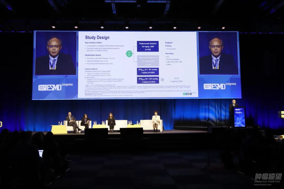 《肿瘤瞭望》:胡教授您好,非常感谢您带来这项备受瞩目的Ⅲ期研究。作为首个头对头对比博度曲妥珠单抗与恩美曲妥珠单抗(T-DM1)的研究,其预设期中分析已显示博度曲妥珠单抗在PFS上有显著改善。能否请您具体解读一下本次ESMO公布的完整研究数据?